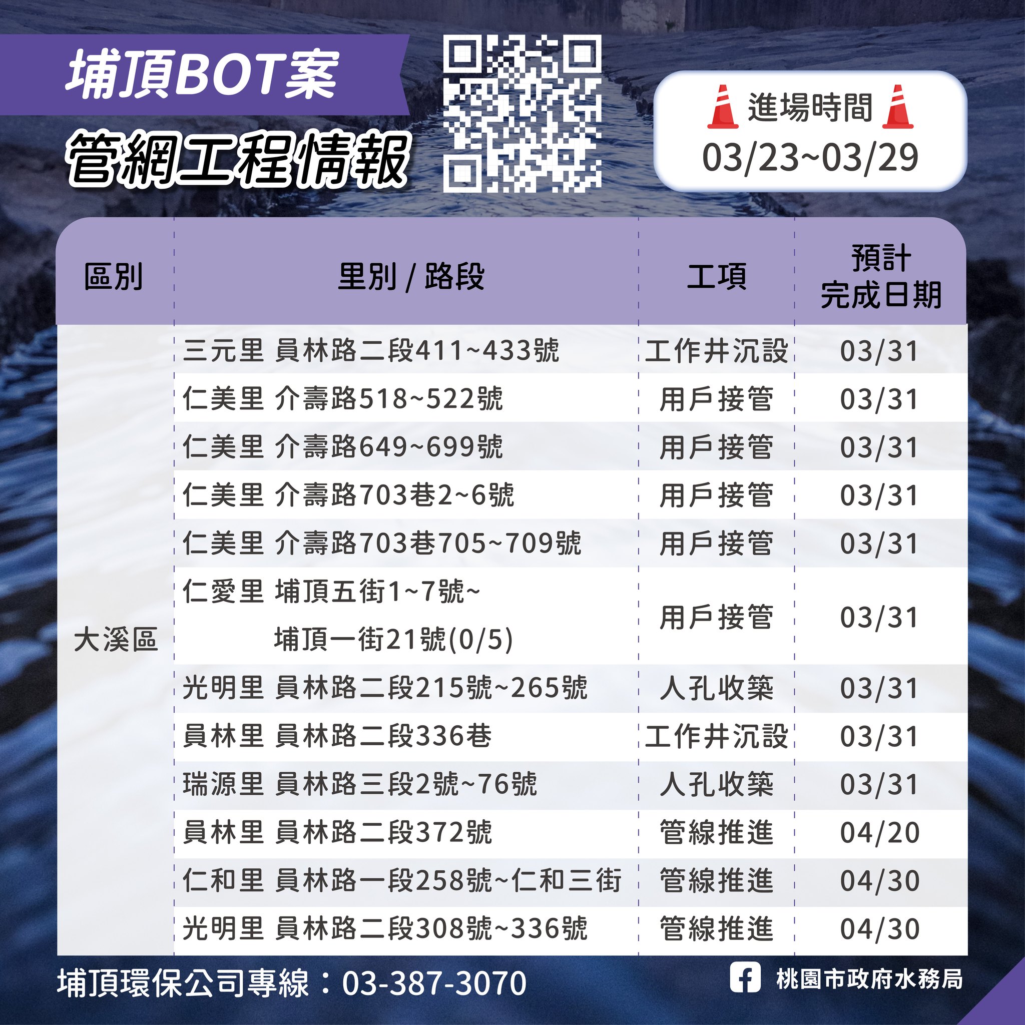 埔頂BOT污水下水道建設管網工程情報03/23-03/29 user2026-03-23T09:39:14+08:00 user 在〈埔頂BOT污水下水道建設管網工程情報03/23-03/29〉中留言功能已關閉 載自桃園市政府水務局FB《水利重點工程Meet桃報》 https://www.facebook.com/wbrtycg/?locale=zh_TW 瀏覽總人數: 430 , 今日瀏覽人數: 5