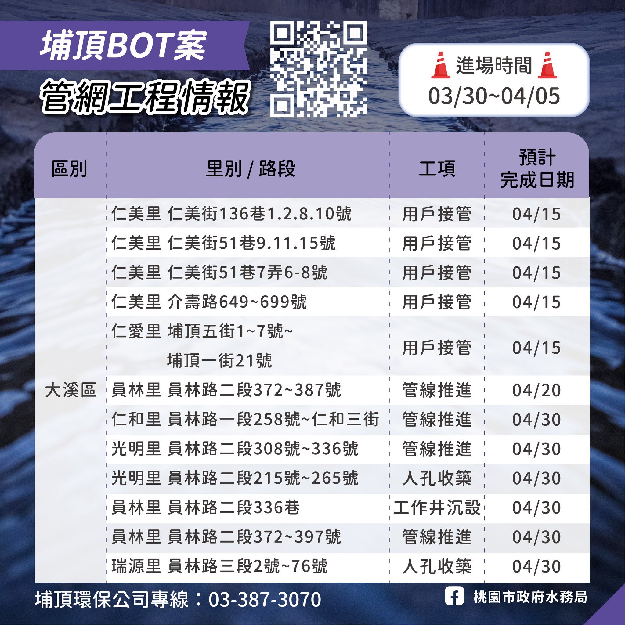 埔頂BOT污水下水道建設管網工程情報03/30-04/05 user2026-03-30T09:33:41+08:00 user 在〈埔頂BOT污水下水道建設管網工程情報03/30-04/05〉中留言功能已關閉 載自桃園市政府水務局FB《水利重點工程Meet桃報》 https://www.facebook.com/wbrtycg/?locale=zh_TW 瀏覽總人數: 453 , 今日瀏覽人數: 5