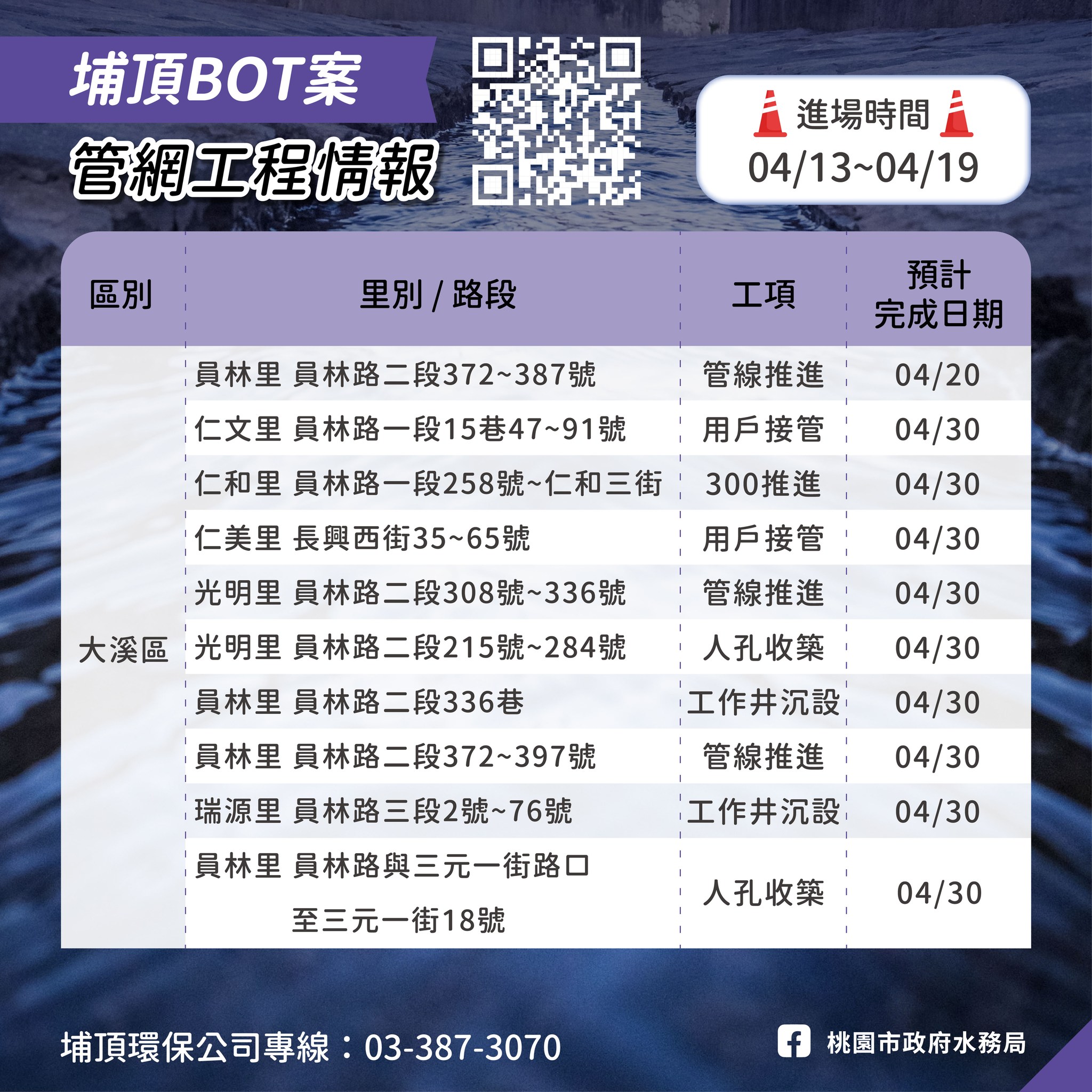 埔頂BOT污水下水道建設管網工程情報04/13-04/19 user2026-04-13T14:20:46+08:00 user 在〈埔頂BOT污水下水道建設管網工程情報04/13-04/19〉中留言功能已關閉 載自桃園市政府水務局FB《水利重點工程Meet桃報》 https://www.facebook.com/wbrtycg/?locale=zh_TW 瀏覽總人數: 232 , 今日瀏覽人數: 3