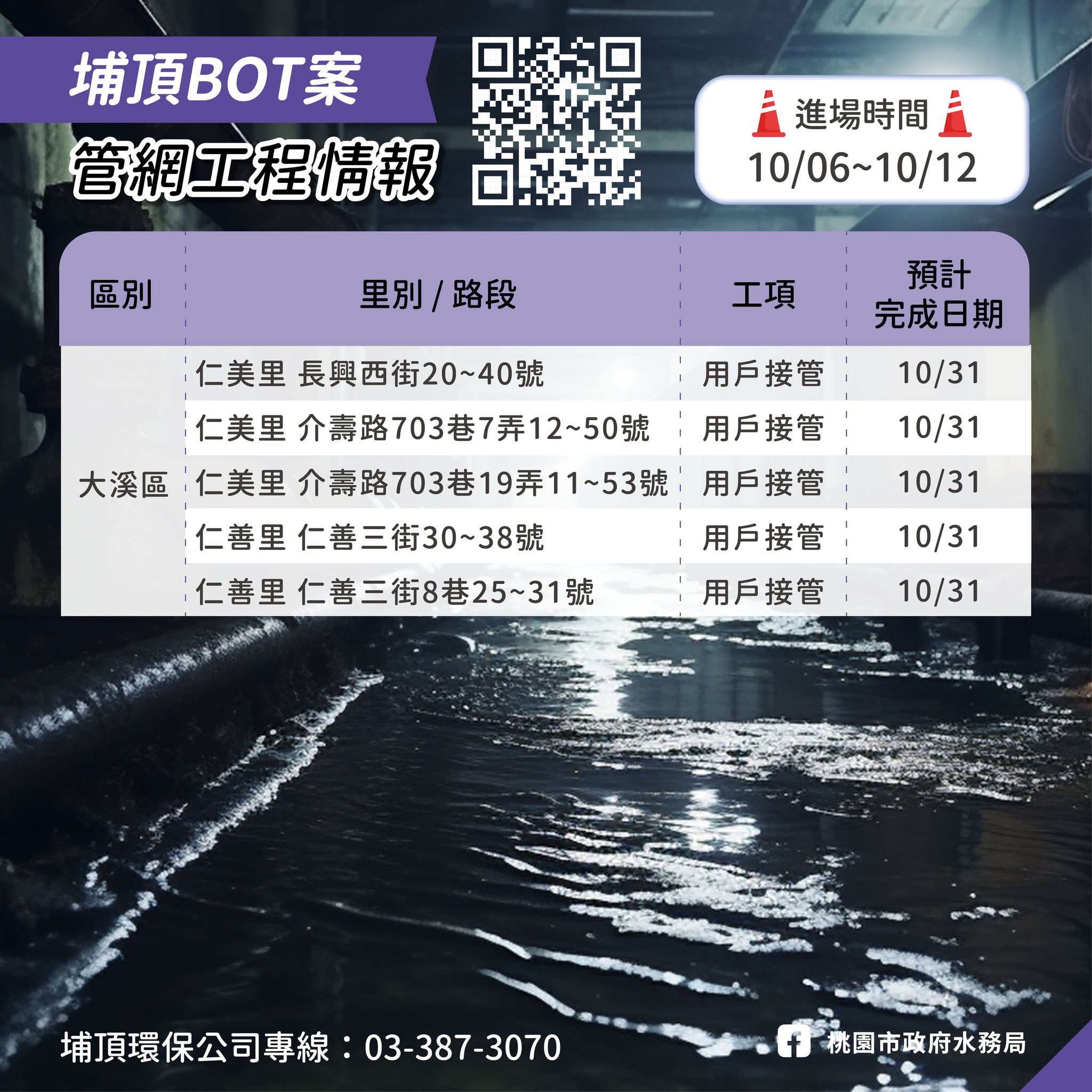 埔頂BOT污水下水道建設管網工程情報10/06-10/12 user2025-10-06T09:33:44+08:00 user 在〈埔頂BOT污水下水道建設管網工程情報10/06-10/12〉中留言功能已關閉 載自桃園市政府水務局FB《水利重點工程Meet桃報》 https://www.facebook.com/wbrtycg/?locale=zh_TW 瀏覽總人數: 110 , 今日瀏覽人數: 3