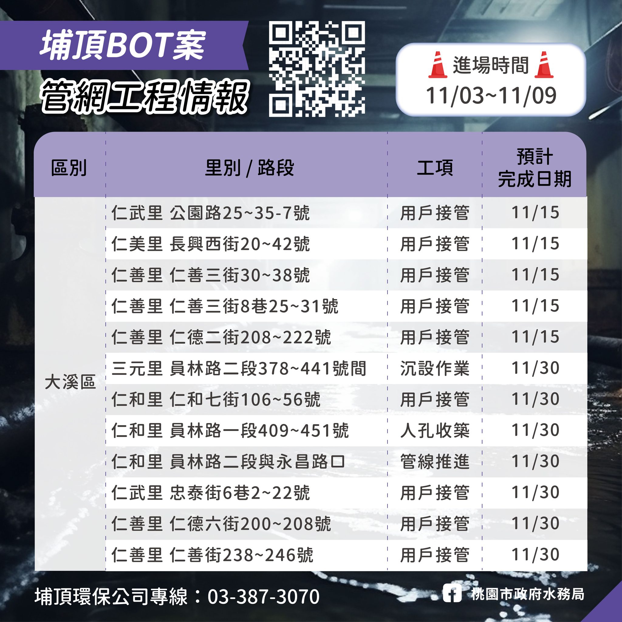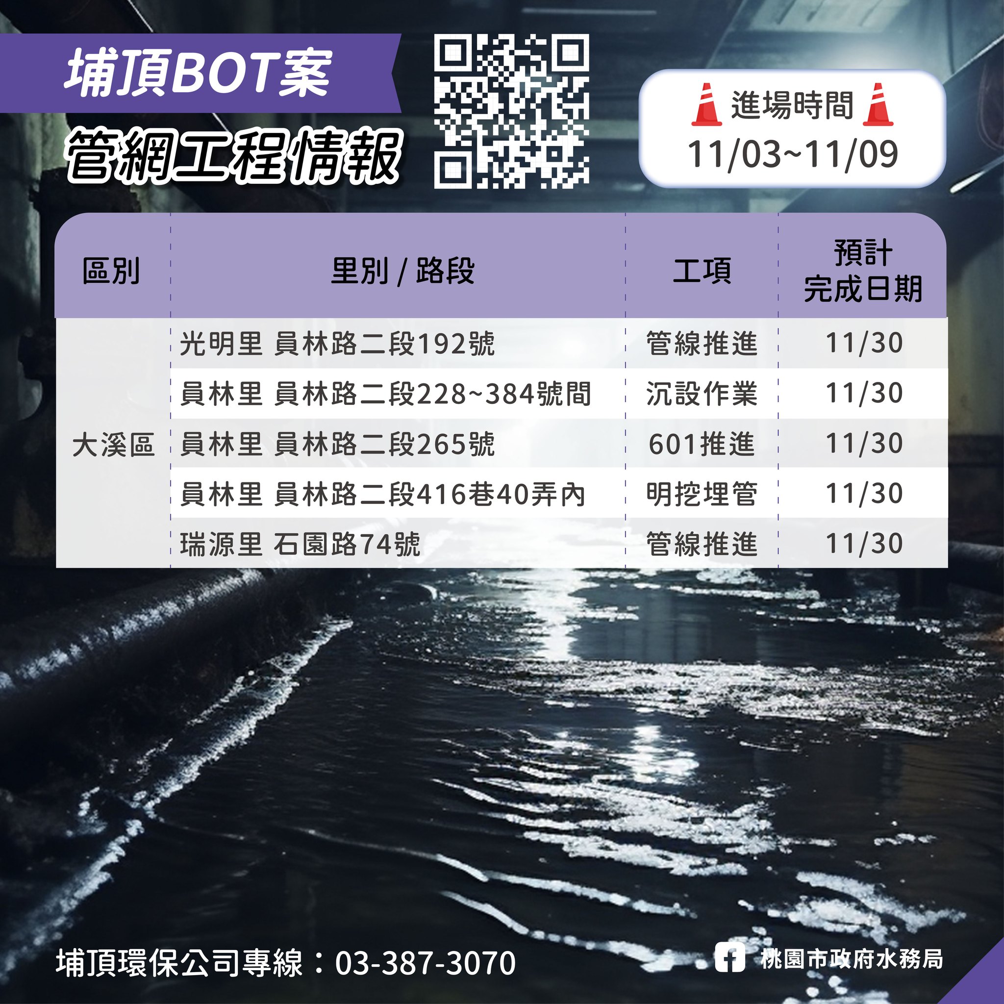 埔頂BOT污水下水道建設管網工程情報11/03-11/09 user2025-11-03T13:18:29+08:00 user 在〈埔頂BOT污水下水道建設管網工程情報11/03-11/09〉中留言功能已關閉 載自桃園市政府水務局FB《水利重點工程Meet桃報》 https://www.facebook.com/wbrtycg/?locale=zh_TW0 瀏覽總人數: 66 , 今日瀏覽人數: 5