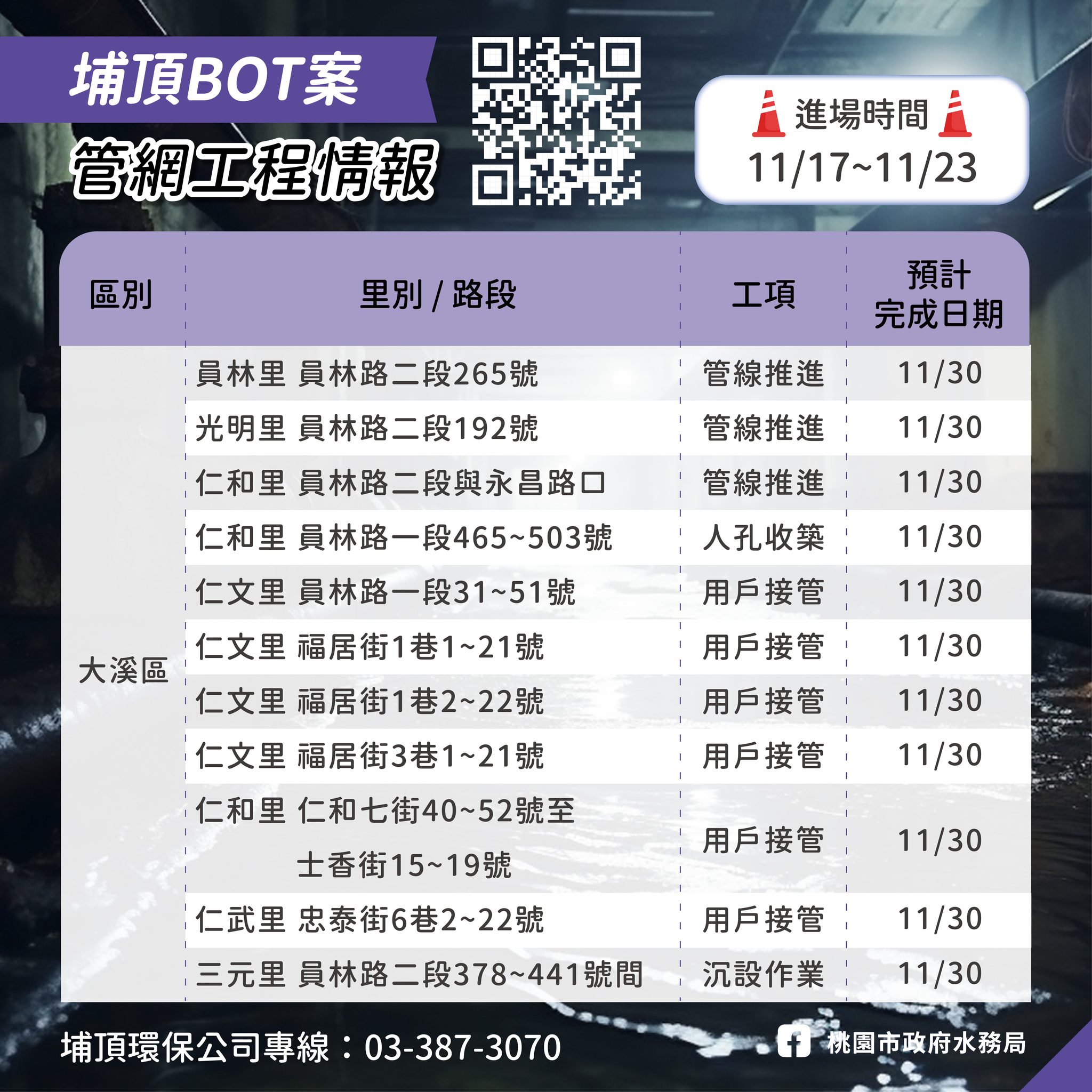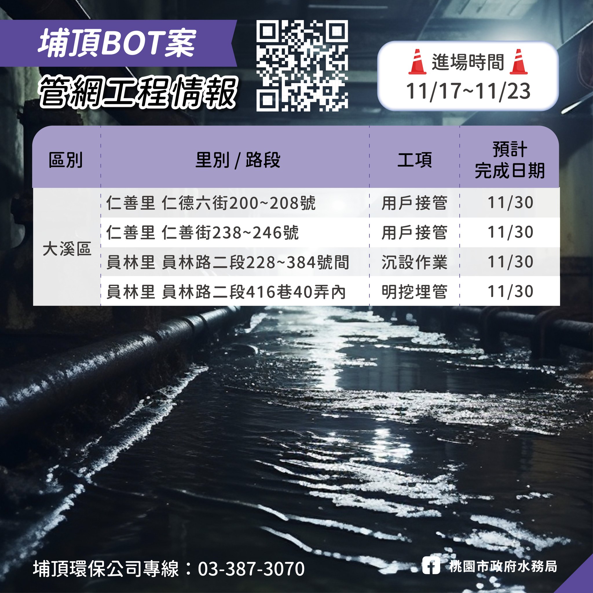 埔頂BOT污水下水道建設管網工程情報11/17-11/23 user2025-11-17T11:51:02+08:00 user 在〈埔頂BOT污水下水道建設管網工程情報11/17-11/23〉中留言功能已關閉 載自桃園市政府水務局FB《水利重點工程Meet桃報》 https://www.facebook.com/wbrtycg/?locale=zh_TW 瀏覽總人數: 58 , 今日瀏覽人數: 10