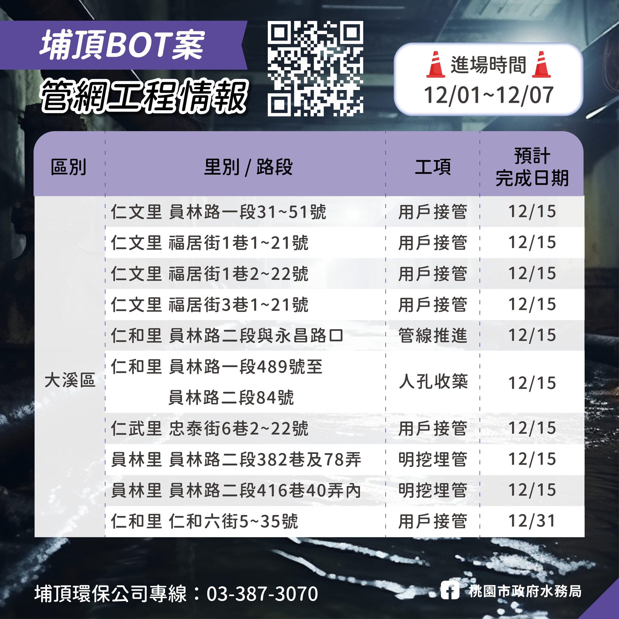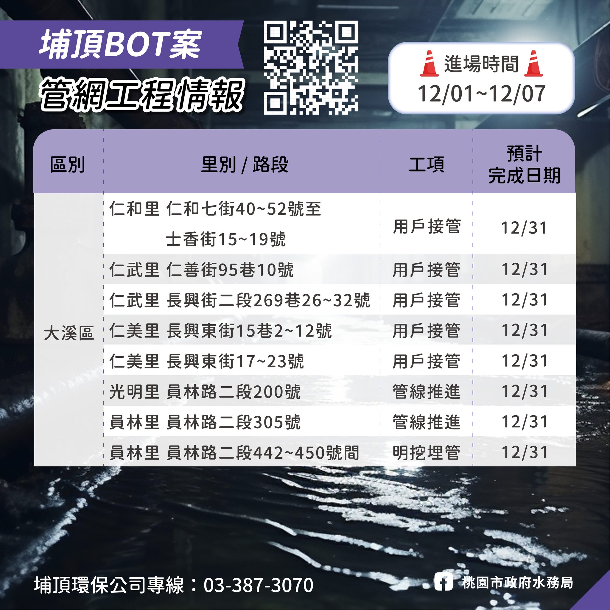 埔頂BOT污水下水道建設管網工程情報12/01-12/07 user2025-12-01T08:44:06+08:00 user 在〈埔頂BOT污水下水道建設管網工程情報12/01-12/07〉中留言功能已關閉 載自桃園市政府水務局FB《水利重點工程Meet桃報》 https://www.facebook.com/wbrtycg/?locale=zh_TW 瀏覽總人數: 38 , 今日瀏覽人數: 5